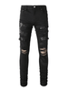 Cracked Silver Leather Patch Ripped Black Jeans Men's Streetwear Denim