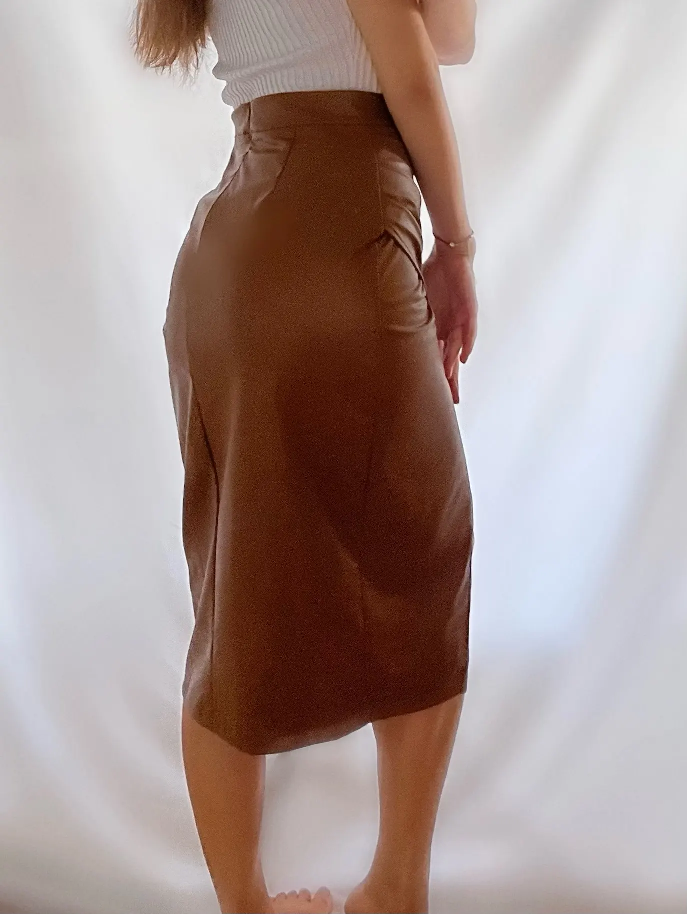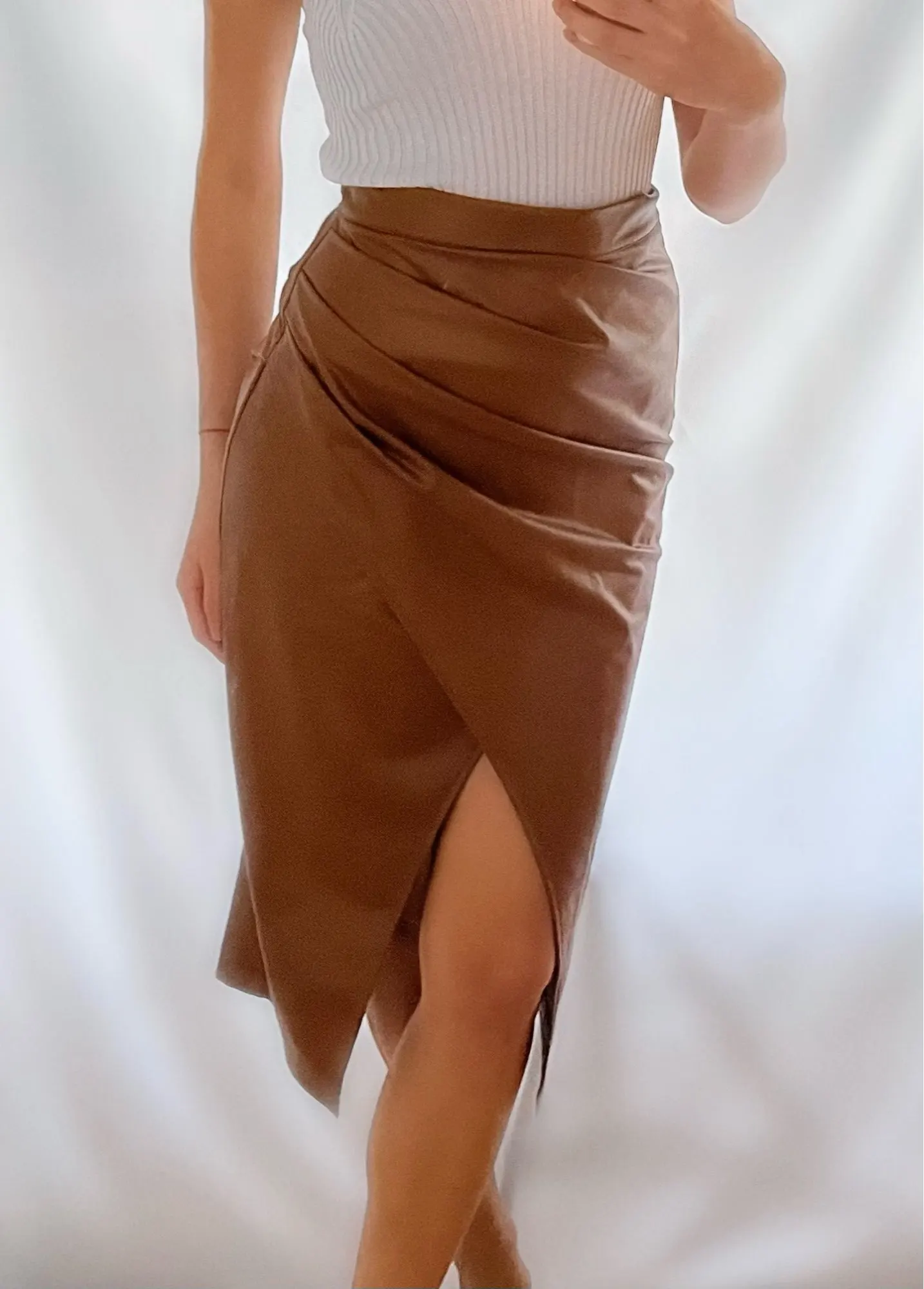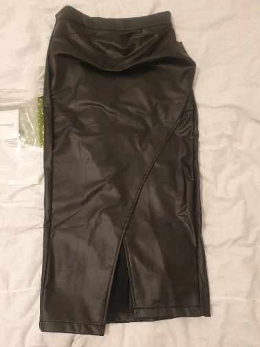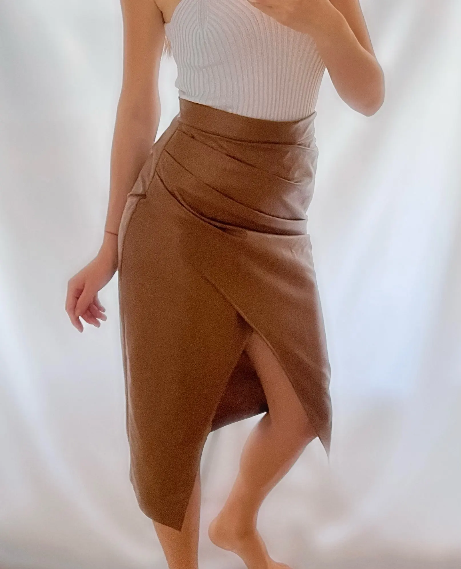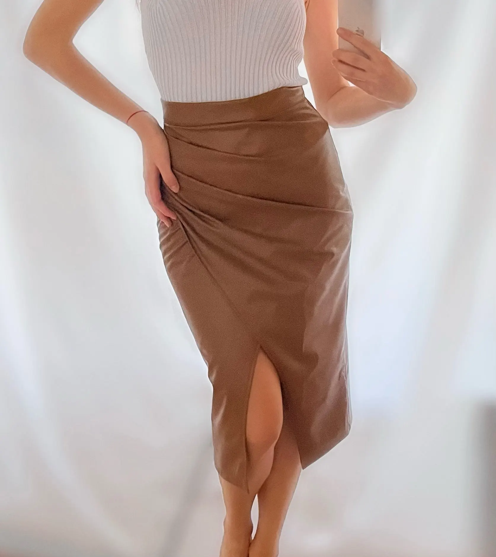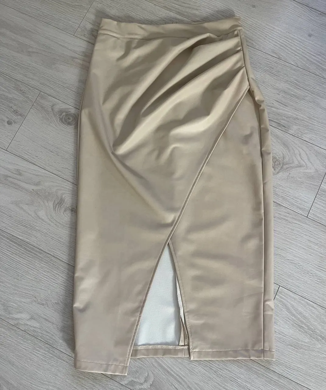 Women's Midi Leather Skirt Sexy Split High Waist Front Slit Skirts Ladies Black Faux Leather Folded Skirt For Women
